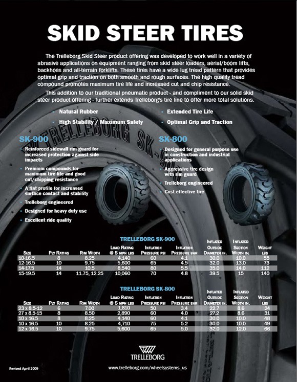 | Description | Section Width (in) – inflated | Overall Diameter (in) – inflated | Tread Depth (in)-NSD | Inflation Pressure (PSI) | Load Capacity* (lbs) | Recommended Rim Size (in) | Weight (lbs) |
